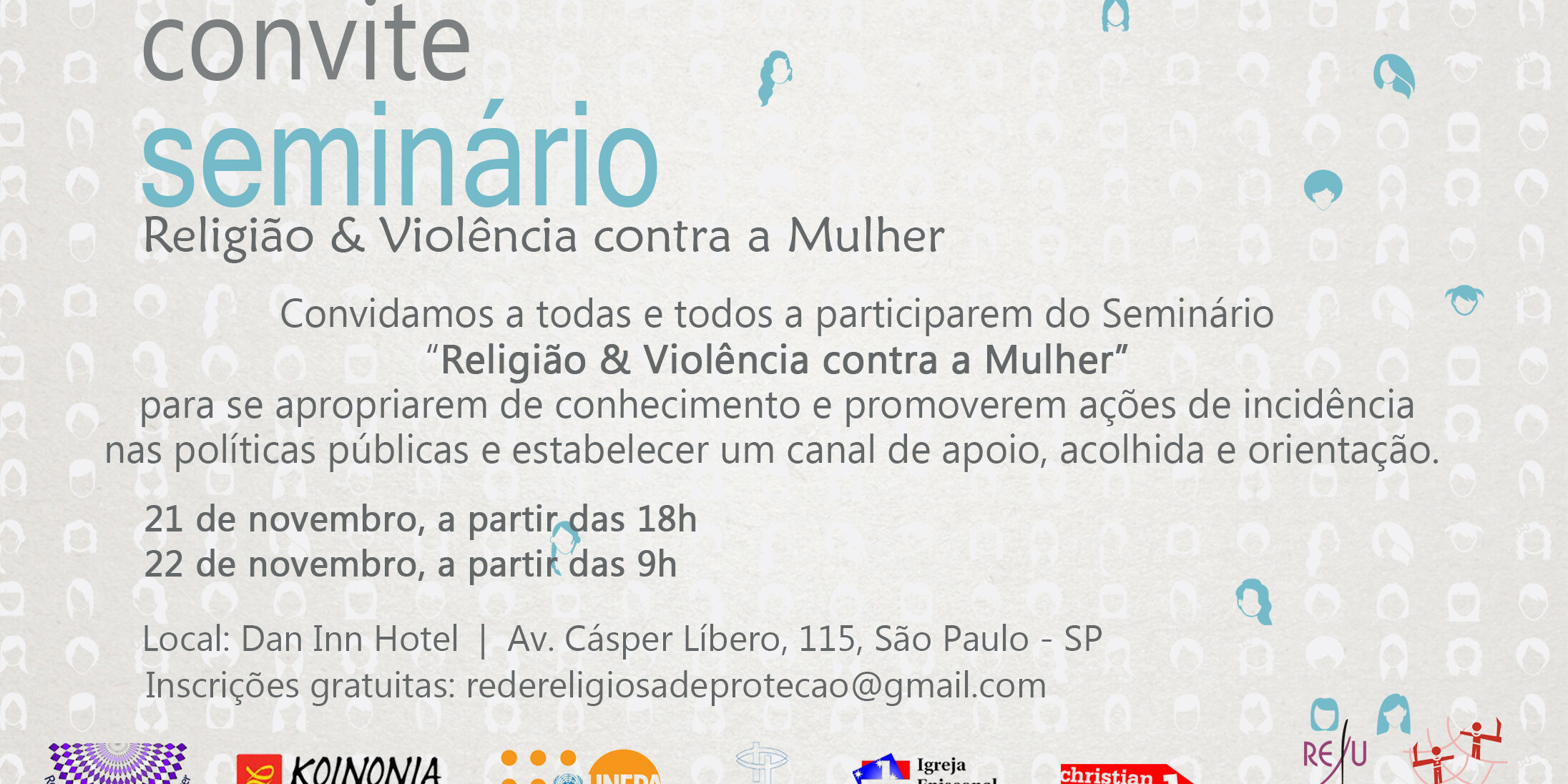 A Rede Religiosa de Proteção à Mulher Vítima de Violência tem o prazer de convida-las(os) para o Seminário Religião & Violência contra a Mulher, que acontece nos dias 21 e 22 de novembro, no Hotel Dan Inn, Av. Cásper Líbero, 115, São Paulo – SP.